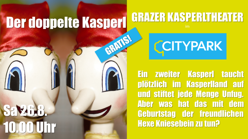 Datum/Zeit 26. August 202310:00 - 10:45 Veranstaltungsort Citypark Ticketverkaufsstellen Der doppelte Kasperl
