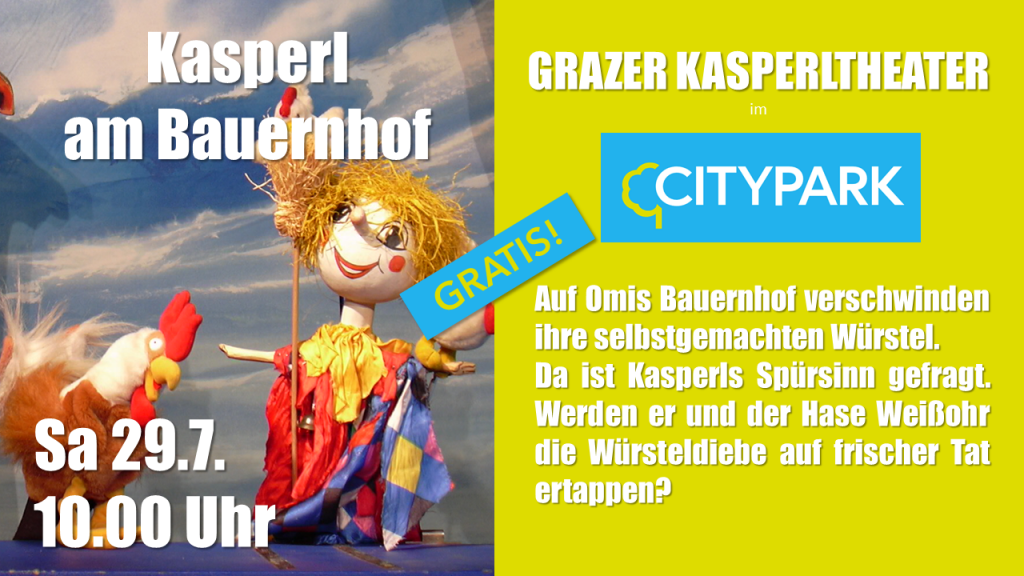 Datum/Zeit 29. Juli 202310:00 - 10:45 Veranstaltungsort Citypark Ticketverkaufsstellen Kasperl am Bauernhof