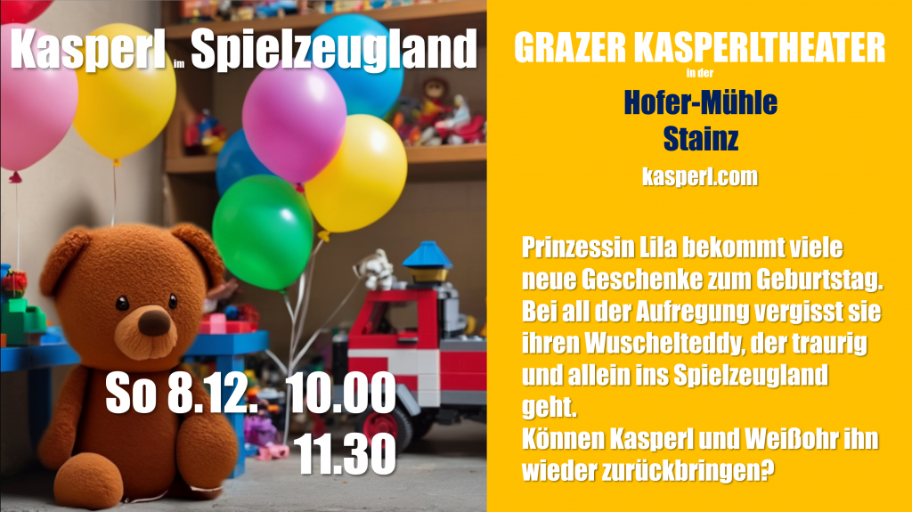 Datum/Zeit 8. Dezember 202410:00 - 10:45 Veranstaltungsort Hofer Mühle Ticketverkaufsstellen Kasperl im Spielzeugland