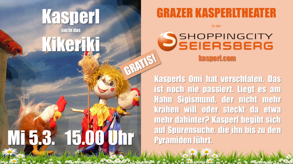 Datum/Zeit 5. März 202515:00 - 15:45 Veranstaltungsort ShoppingCitySeiersberg Ticketverkaufsstellen Kasperl sucht das Kikeriki