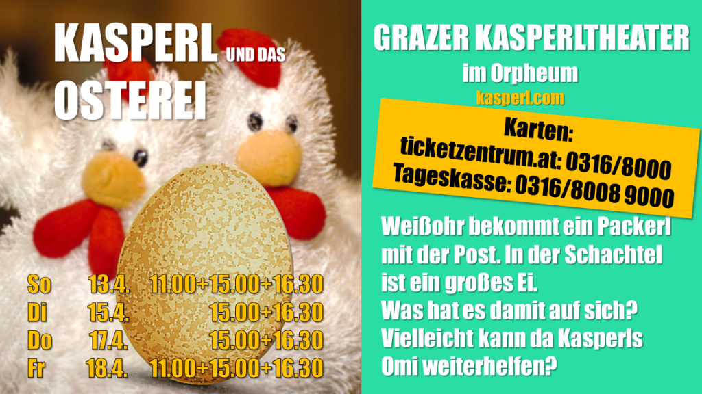 Datum/Zeit 15. April 202515:00 - 15:45 Veranstaltungsort Orpheum Graz Ticketverkaufsstellen Kasperl und das Osterei