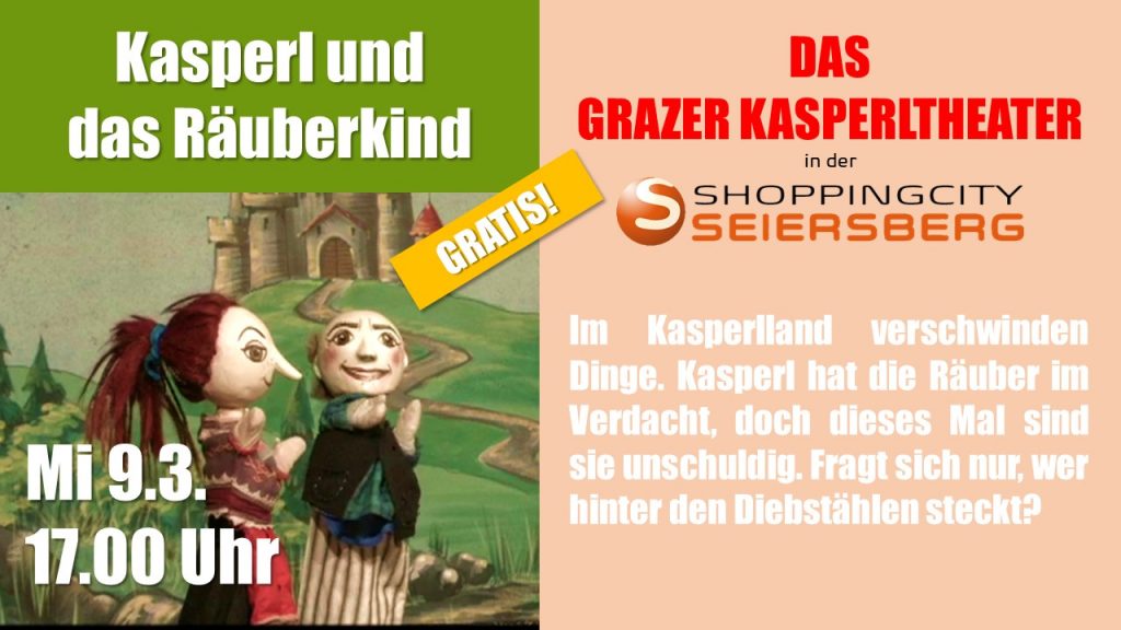 Datum/Zeit 9. März 202217:00 - 17:45 Veranstaltungsort ShoppingCitySeiersberg Ticketverkaufsstellen Kasperl und das Räuberkind