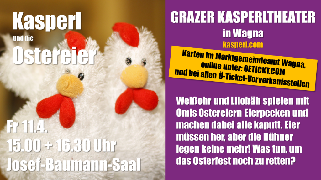Datum/Zeit 11. April 202516:30 - 17:15 Veranstaltungsort Kultursaal Wagna Ticketverkaufsstellen Kasperl und die Ostereier
