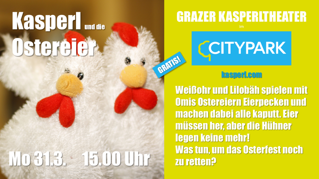 Datum/Zeit 31. März 202515:00 - 15:45 Veranstaltungsort Citypark Ticketverkaufsstellen Kasperl und die Osterreier