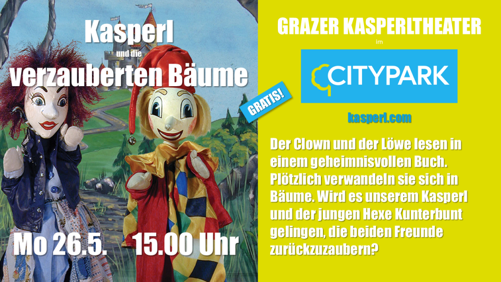 Datum/Zeit 26. Mai 202515:00 - 15:45 Veranstaltungsort Citypark Ticketverkaufsstellen Kasperl und die verzauberten Bäume