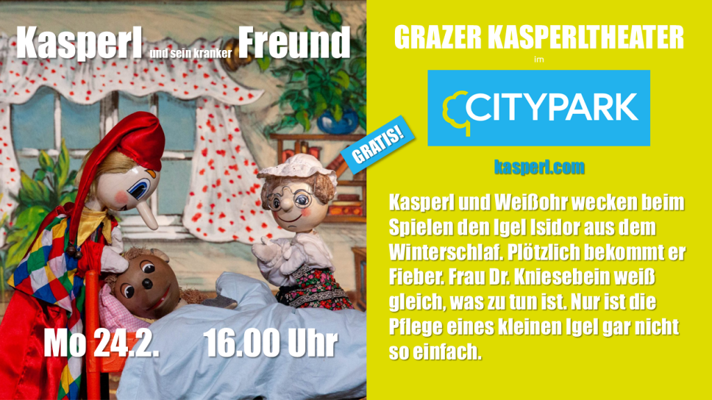 Datum/Zeit 24. Februar 202516:00 - 16:45 Veranstaltungsort Citypark Ticketverkaufsstellen Kasperl und sein kranker Freund